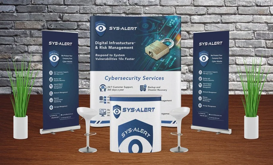 My brand identity for SYS-ALERT began with the logo, as I explored various approaches to monitoring the company's customers' data. I decided on an all-seeing eye within a shield, implying that SYS-ALERT is always guarding everyone's important information. Once I determined a final logo concept, I concentrated on refining the color palette. I wanted a combination that reflected SYS-ALERT's image of being a reliable company and its commitment to safeguarding its customers' data. Ultimately, I decided on a subtle blue gradient, symbolizing the steadiness and strength within the company, as well as the company's dedication to protecting sensitive information. For my branding guidelines, I envisioned a clean, technological aesthetic that accompanied SYS-ALERT's brand image, focusing on the tenet that "less is more." In promotional and office materials, I focused on a color palette consisting primarily of shades of blue, gray, black, and off-white, designed to complement the blue gradient featured in the logo. I mainly employed various geometric accents, including lines and rectangles. All of these elements work together to ensure that SYS-ALERT's brand identity is cohesive and memorable in the minds of its customers.
