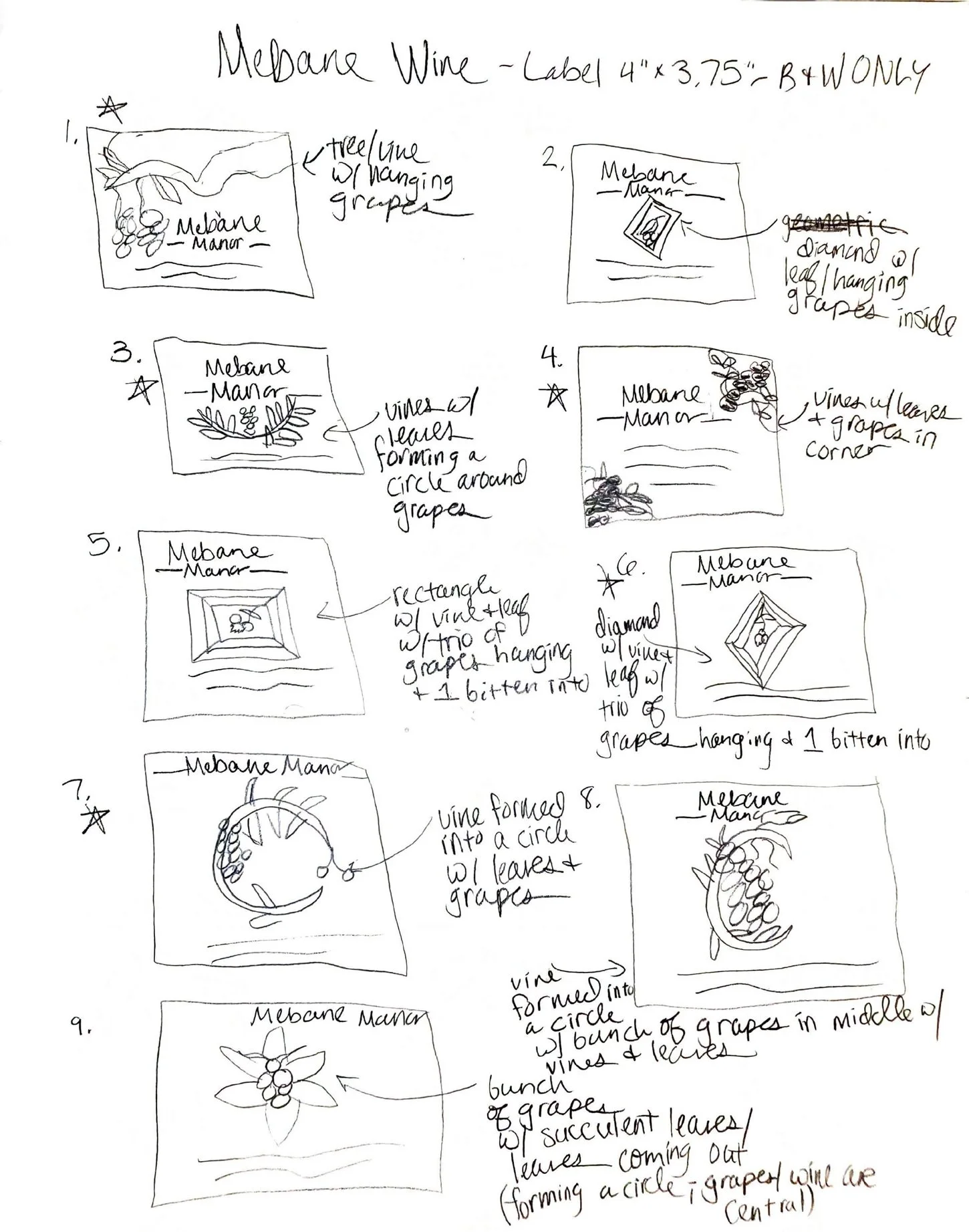 In my initial thumbnails, I sketched various rough concepts for the wine labels. My primary focus was iterations of leaves, grapes, and other nature imagery.