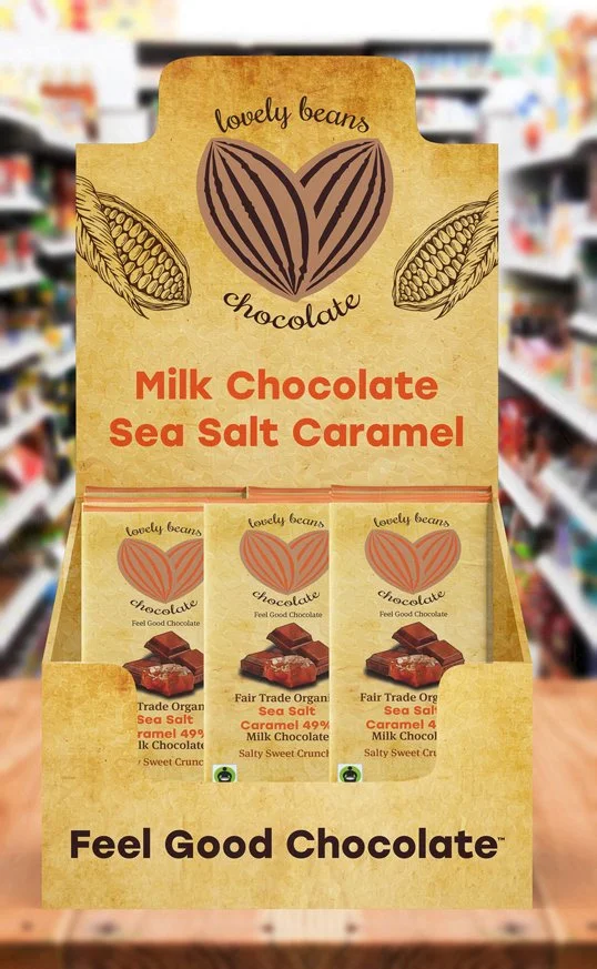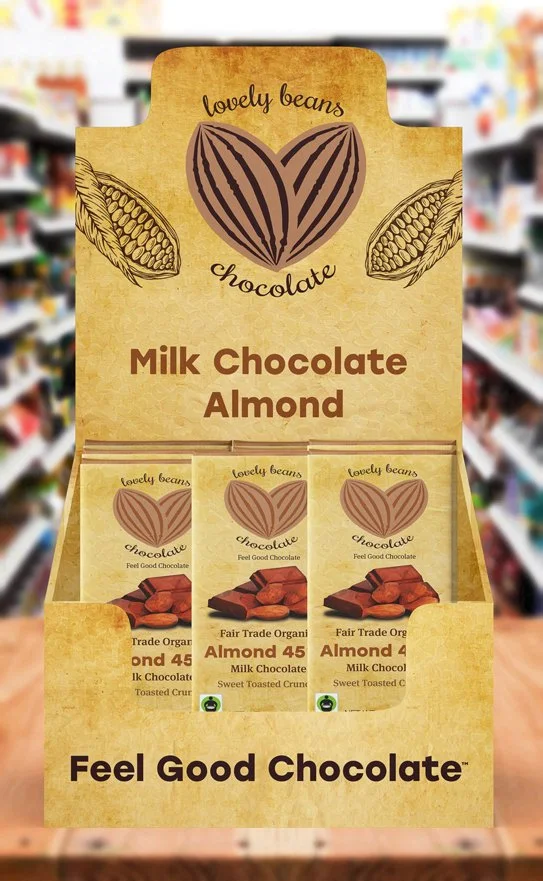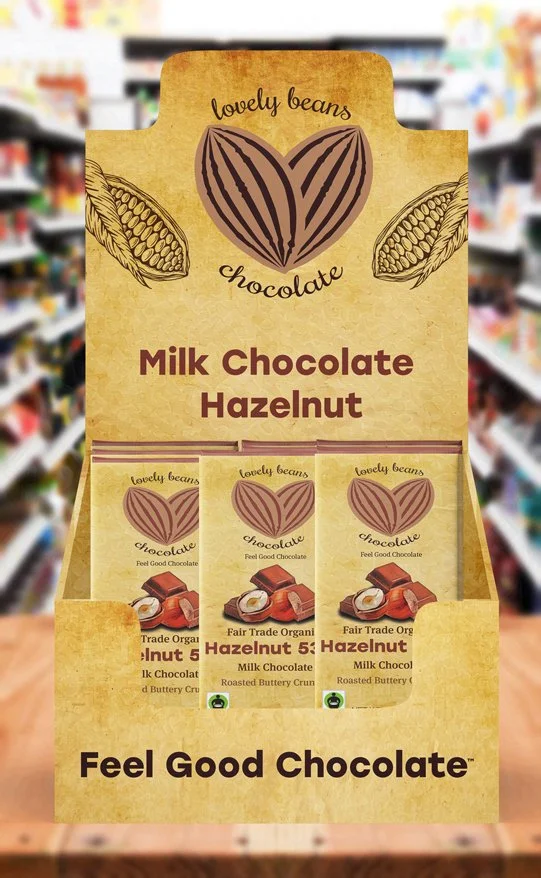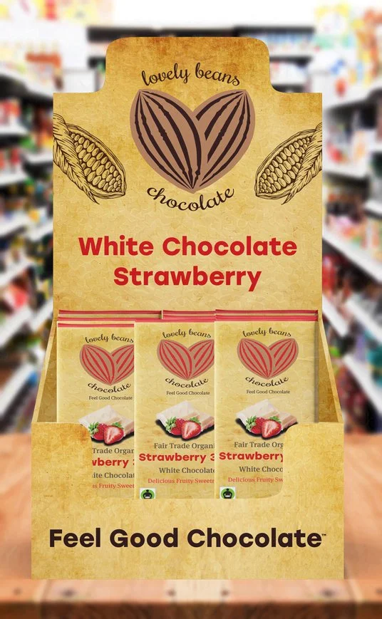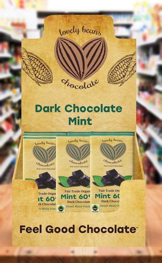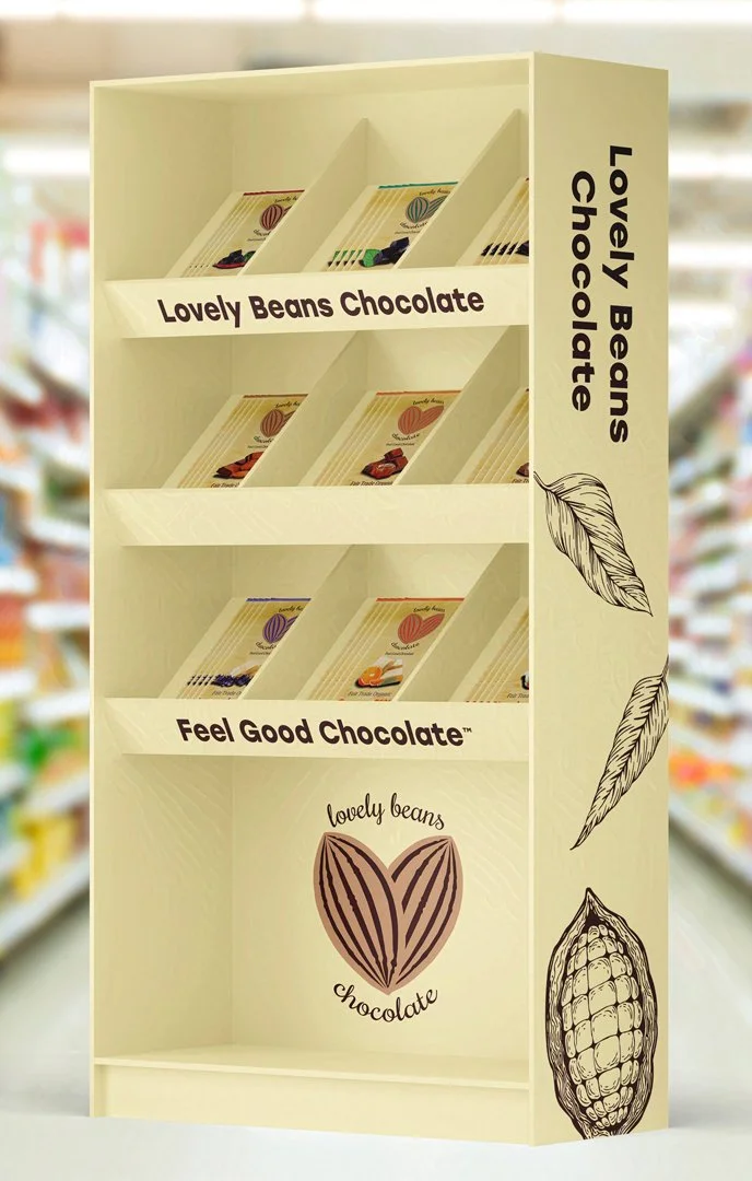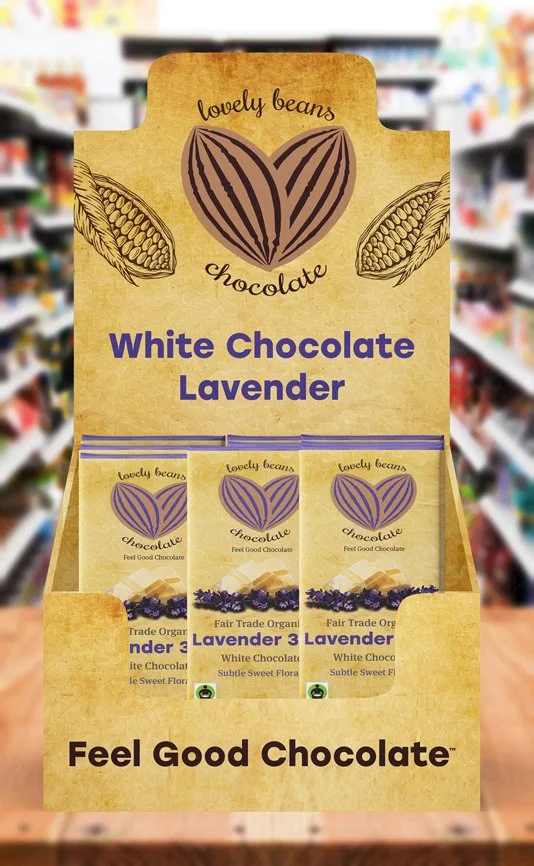 As another part of my packaging concept for Lovely Beans Chocolate, I created several point-of-sale displays to advertise how the packaging might look in grocery stores. These point-of-sale displays included smaller countertop displays for each chocolate flavor, as well as a larger display showcasing all the chocolate bars together. I included two photos of the larger point-of-sale shelf showing it from two different angles.