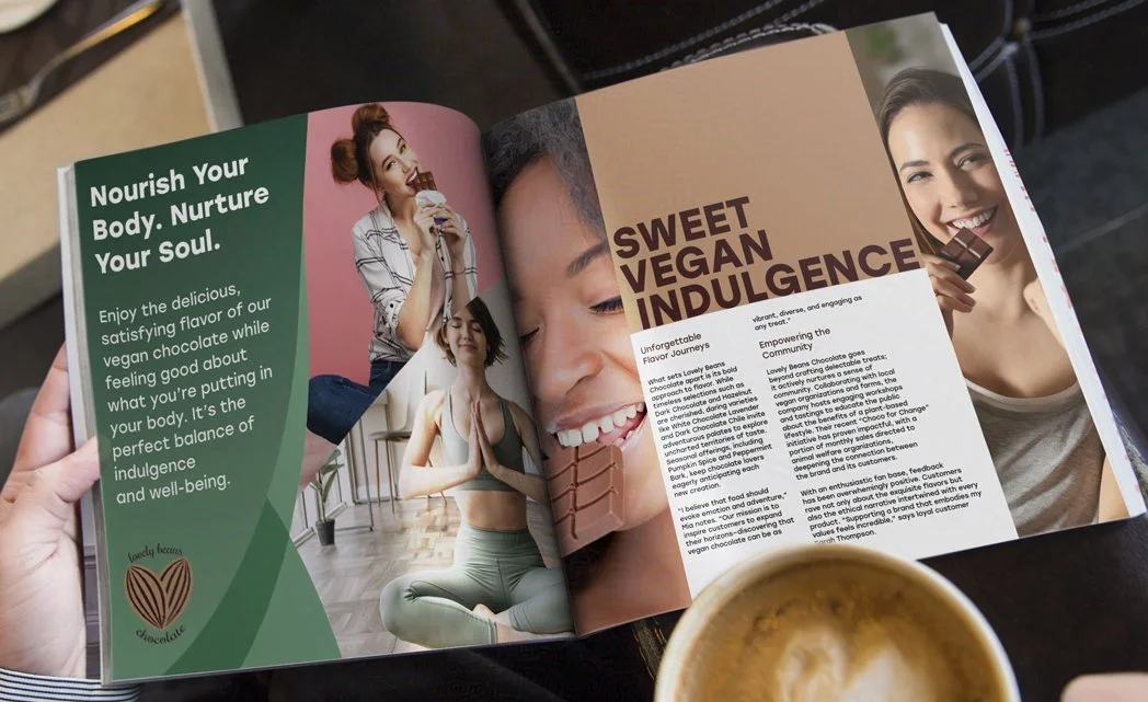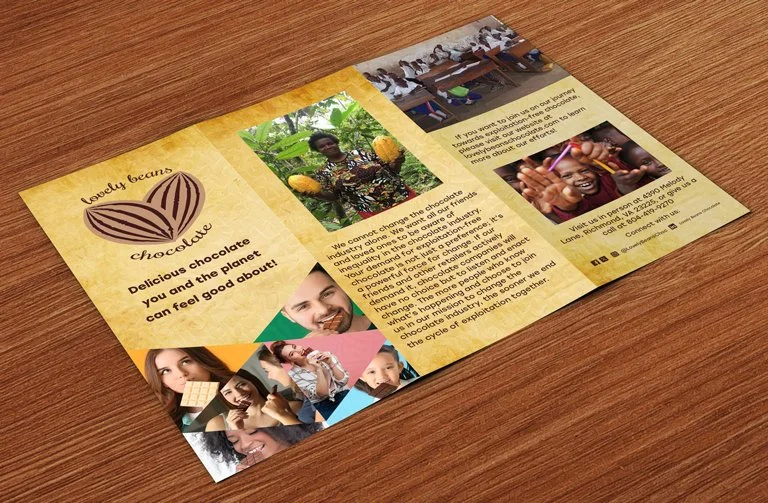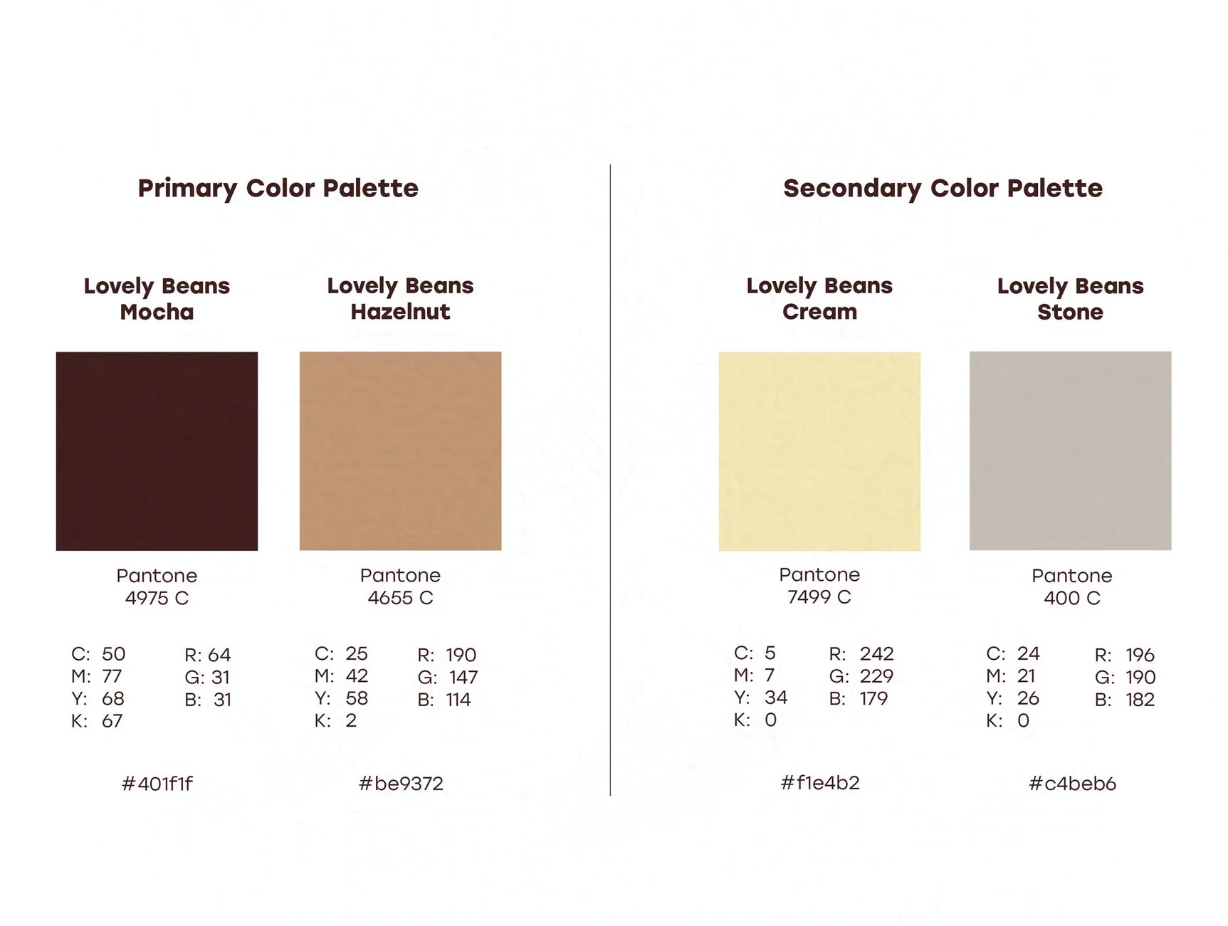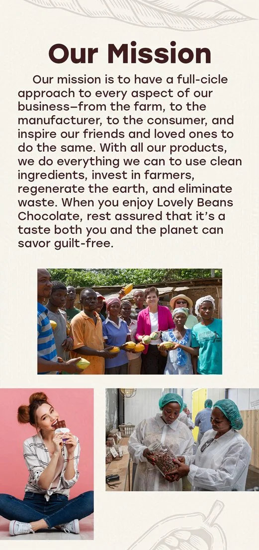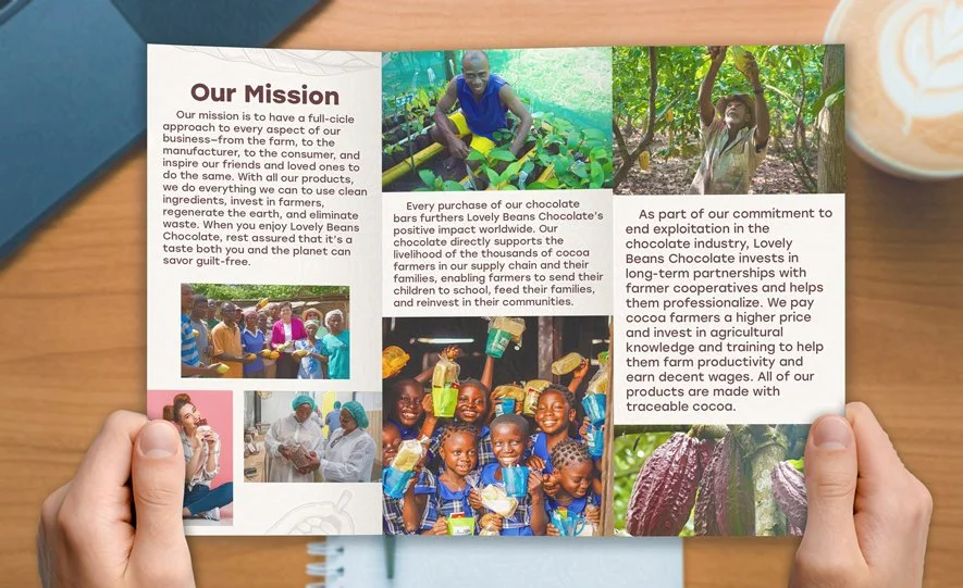 For my branding guidelines, I envisioned a clean and all-natural aesthetic that aligns with the company’s vegan brand image. In the primary logo, I used a color palette of complementary shades of brown to evoke the image of the delicious chocolate offered by the company. The secondary color scheme, consisting of a creamy yellow and a warm grayish-brown, was chosen for its complementary attributes related to the primary colors and the main logo. To help promote the brand identity and reinforce the company’s products in the minds of consumers, I also created a collection of secondary illustration elements, consisting of stylized depictions of cocoa beans and cocoa plants, to add visual interest to the various branding materials. These elements work together to ensure that the Lovely Beans Chocolate brand identity is strong and unified.