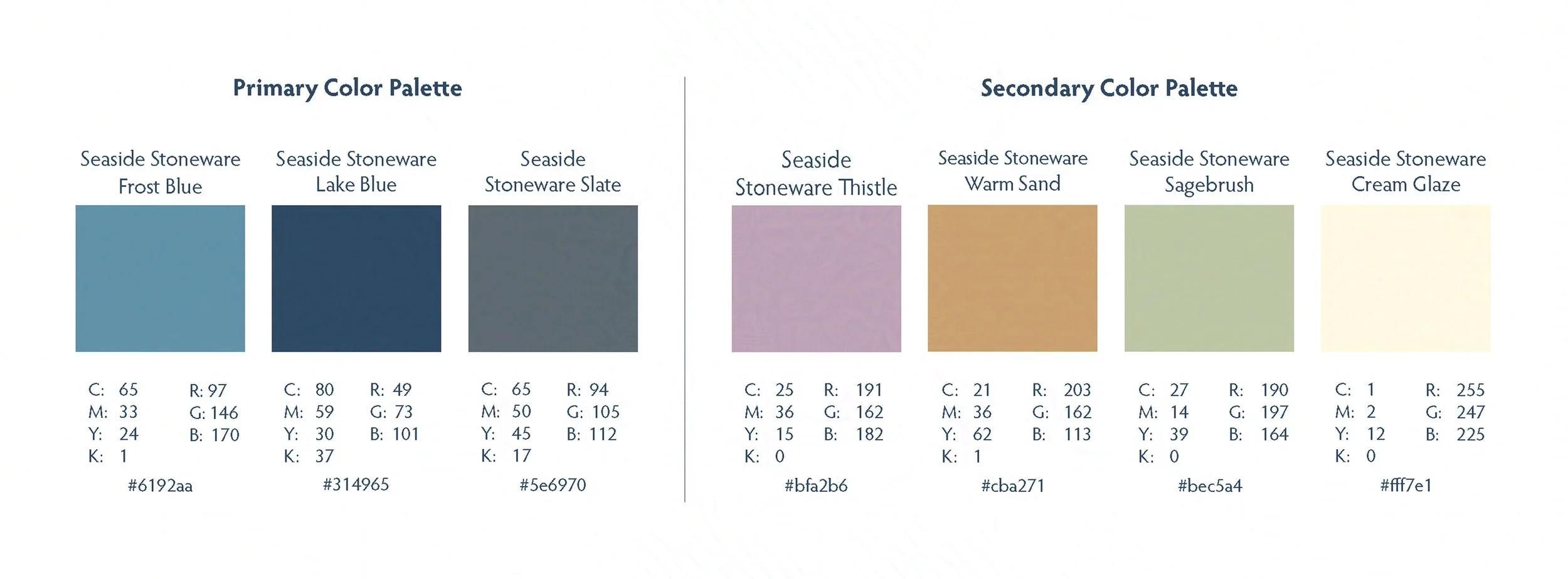 In designing the color palette for Seaside Stoneware, I drew inspiration from the serene beauty of the Brighton coastline. The primary colors reflect the tranquil blues of the ocean, while the secondary palette captures the soft, sandy neutrals of the surrounding landscape. This combination evokes a sense of calm and a connection to the natural world. I carefully selected each color to represent the handcrafted spirit of the ceramics and complement the unique designs of the pottery. By incorporating these natural tones, the palette emphasizes the artisanal quality of the work and invites customers to envision the coastal environment in which these pieces were created, enhancing their overall experience with Seaside Stoneware.