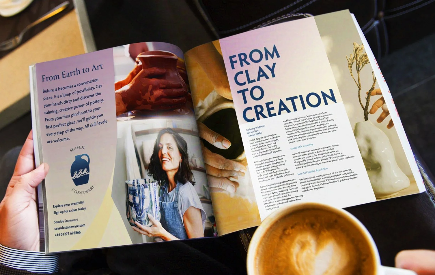 In designing the print advertisement for Seaside Stoneware, I aimed to capture the creative journey of pottery making, transforming the ad into a visual narrative that resonates with audiences. By showcasing the steps from molding the clay to the finished piece, I highlighted the artistry and meticulous craftsmanship that go into each piece. Through striking imagery and an engaging layout, the advertisement invites viewers to appreciate not only the beautiful products but also the passion and dedication of the artisans behind them. This approach not only highlights Seaside Stoneware's unique offerings but also celebrates the rich tradition of pottery as a form of creative expression.